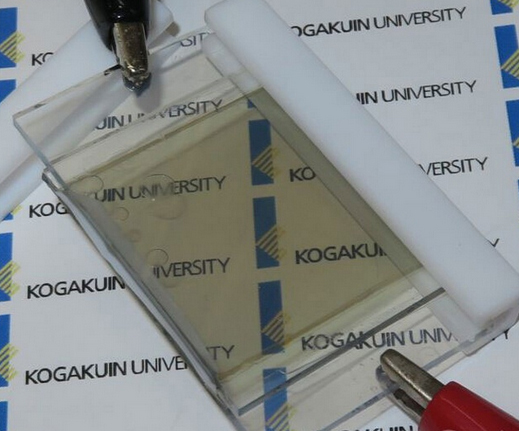 佐藤研究室此次展出了尚未发表论文的新装置。新装置对上述半透明锂离子二次电池的材料略微做了变更,可将射入负极的光激发的电子直接用于电池充电。