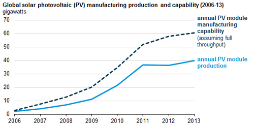 据美国能源信息署(EIA)最新报告显示,近年来,全球太阳能光伏组件产量增速开始放缓,2006-2011年年均增长78%,2011-2013年下降到4%。同时,由于全球光伏组件装机容量与产量之间差距的拉大,光伏组件生产的利用率也在不断下降。
