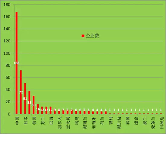 2015年“500强”上榜企业分别来自37个国家和地区,比2014年“500强”多1个国家。其中,中国(中国大陆及香港、澳门、台湾)有协鑫(集团)控股有限公司、晶龙实业集团有限公司、国电科技环保集团股份有限公司、龙源电力集团股份有限公司、天能集团、阿特斯阳光电力科技有限公司、新疆金风科技股份有限公司等168家企业进入“500强”榜单,比去年(163家)增加5家,占33.6%,居首位;美国有GE Energy、Archer Daniels Midland Company、Dow Corning Corporation、Valero Energy Corporation、Bunge Ltd.、POET LLC、First Solar Inc.、Sunpower Corporation、SunEdison Inc.等72家企业进入“500强”榜单,比去年(74家)少2家,占14.4%,位居第二;日本则有Sanyo Electric Co., Ltd.、Sharp Corporation、Toshiba Corporation、Kyocera Corporation、Solar Frontier K.K.等51家企业进入“500强”榜单,比去年(41家)多10家,占10.2%,排名超过德国升至第三;德国有Siemens AG、Enercon GmbH、E.ON Kraftwerke GmbH、Nordex SE、Juwi Holding AG等38家企业进入“500强”榜单,比去年(48)少10家,占7.6%,退居第四;韩国有OCI Company Ltd.、LG Chem., Ltd. 、SK Group等30家企业进入“500强”榜单,与去年(30家)持平,占5.8%,位居第五;西班牙则有16家,占3.2%,位居第六; 芬兰、法国、巴西各12家,各占2.4%,并列第七;印度9家,占1.8%,位居第十(见图1)。