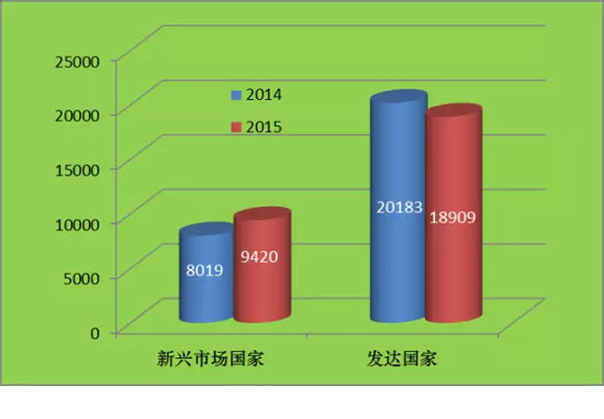 图4 2014、2015“500强”发达国家与新兴市场国家上榜企业总营业收入(单位:亿元)