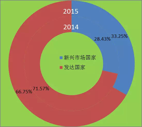 图5 2014、2015“500强”发达国家与新兴市场国家上榜企业总营收占比图
