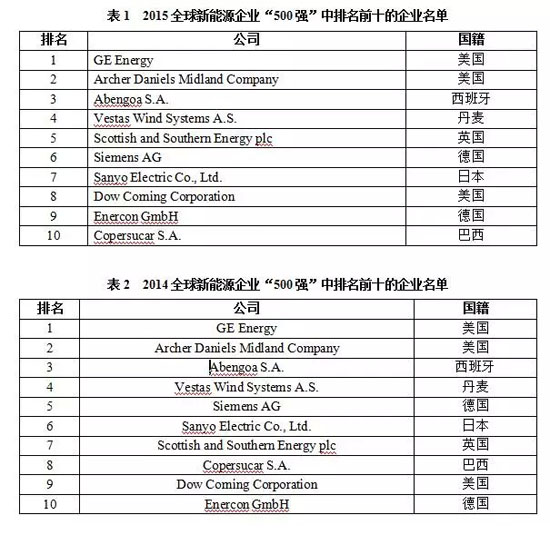 2015“500强”排名前十的企业依次为GE Energy(美国)、Archer Daniels Midland Company(美国)、Abengoa S.A.(西班牙)、Vestas Wind Systems A/S(丹麦)、Scottish and Southern Energy PLC(英国)、Siemens AG(德国)、Sanyo Electric Co., Ltd.(日本)、Dow Corning Corporation(美国)、Enercon GmbH(德国)和Copersucar S.A.(巴西)。连续2年,前十的企业中都出现了新兴市场国家企业的身影,而不再是由发达国家企业独霸。由此可见,新兴市场国家企业的竞争力增强,其与发达国家的差距正减少。