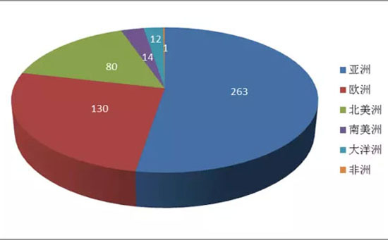 2015“500强”企业地域分布格局与2014 “500强”基本一致,主要分布在3大洲(见图6):亚洲、欧洲和北美洲;其中,亚洲共有263家企业入围榜单,比2014年的245家增加18家,占52.6%,依旧位居首位;欧洲共有130家企业入围榜单,比2014年的141家减少11家,占26%,位居第二;北美洲共有80家企业入围榜单,比2014年的81家减少1家,占16%,位居第三;南美洲14家企业进入榜单,而大洋洲12家企业进入榜单;剩余的1家企业则来自非洲。