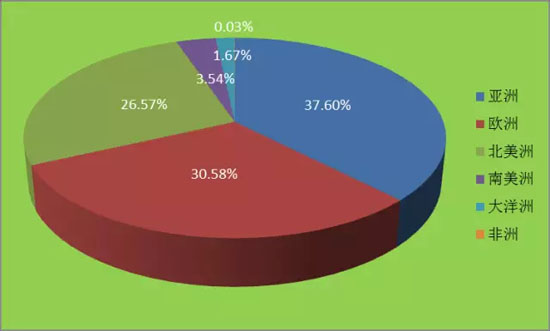 图7 2015全球新能源企业500强各大洲入选企业总营收占比