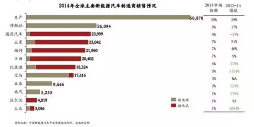 全球新能源汽车生产销售目前由美、日企业主导,并都在14年实现快速增长;中国和德国车企增长迅速,行业地位越发重要。