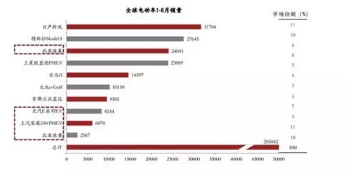 2015年1-8月,中国电动车制造商BYD、北汽、上汽旗下车型持续进入全球销量前十。比亚迪的秦系列在8月份以3500台成为全球电动车销量冠军。