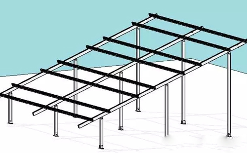 支架的设计需要了解常用的导轨型号和配件,如图5为混凝土屋面所采用的比较常见的支架架构(方阵由2*4片组件组成),由横梁、竖梁、方管、角铝、L支脚、T型螺栓和内六角螺栓、内扣连接件、压块等配件组成,深化设计需要确定各个配件型号、尺寸和数量。