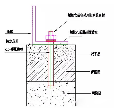 如图4所示为混凝土屋顶膨胀螺栓与屋面的固定方法和屋面防水措施,孔的直径需要和膨胀螺栓的直径匹配,太小和太大都不合适,孔的深度需要根据屋面的结构来定,膨胀螺栓的深度不允许超出现浇层,一般最大深度为现浇层的一半左右,并以此作为选择膨胀螺栓长度的依据。