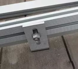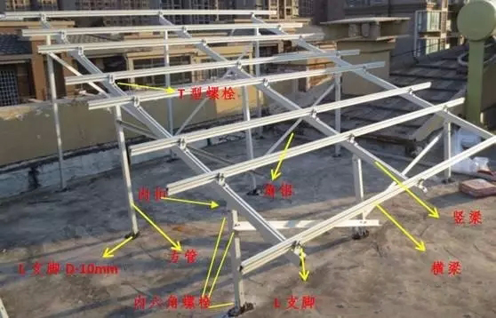 内扣连接件用于连接方管和竖梁,并且可调节角度。竖梁和横梁之间的固定采用L支脚加上M8的T型螺栓,方管和屋面的固定采用膨胀螺栓和L支脚,角铝的作用用于斜支撑加强固定。