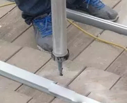 如图6至图8为瓦面屋顶从打孔到导轨安装的施工过程,根据屋面实际情况和组件排布数量,膨胀螺栓安装孔位的前后间距约1米左右,由于混凝土瓦面有一定厚度,瓦面和保温层有几厘米的距离,再打入现浇层后,总共深度约15cm左右,孔位开好之后需要将多余的混凝土土灰用钢管气筒清除干净,灌注硅胶需要见到明显的溢出为佳,膨胀螺栓和L支脚搭配好之后敲入孔内,横梁和L支脚固定,最后在安装孔位四周涂上防水胶,待半干燥后即可安装光伏组件,参考图9。