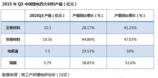 据高工产研锂电研究所(GGII)调研数据显示,2015年第三季度中国锂电池材料产值规模达56.15亿元,同比增长32.5%,环比增长18%。