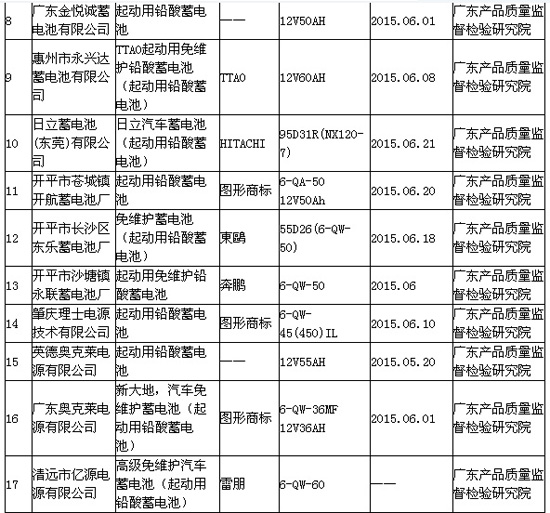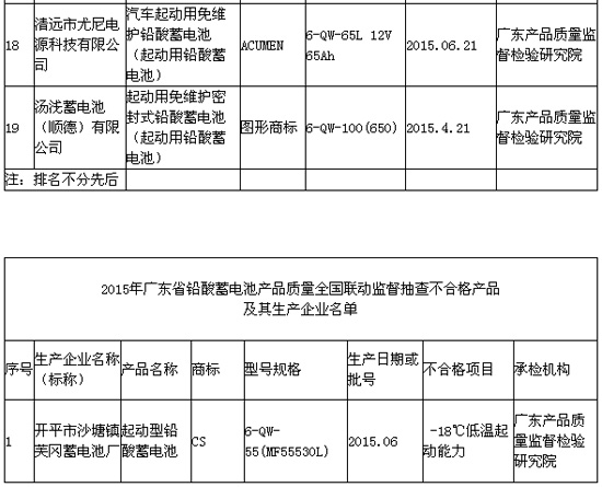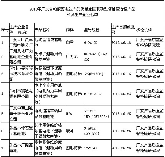 近日,广东省质量技术监督局在其官网公布2015年广东省铅酸蓄电池产品质量全国联动监督抽查结果。本次抽查了广州、深圳、韶关、惠州、江门、清远、佛山、肇庆等8个地市20家企业生产的铅酸蓄电池产品20批次,发现不合格产品1批次,不合格产品发现率为5.00%。