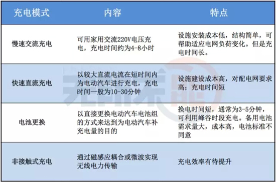 目前电动汽车的充电方式主要包括慢速交流充电、快速直流充电、电池更换和非接触式充电(无线充电)四类,特点如下图: