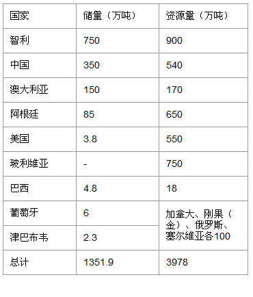 据美国地质调查所2015年 的最新数据,世界已查明的锂资源量约为3950万吨,储量约1350万吨。主要集中在南美的锂三角(智利、阿根廷和玻利维亚),中国的储能和资源量居世界第二,美国的储能仅相当于中国10.86%。同时中国的天齐锂业拥有全球锂矿石巨头泰利森51%的股权,锂资源大量依靠进口根本是无稽之谈。