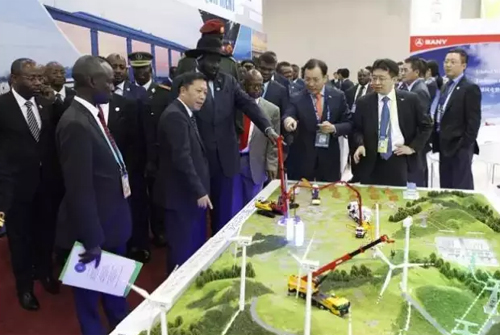 此次中非装备制造业展共有来自电力,铁路和轨道交通、工程机械、金融、航空等领域的43家中国优秀企业参展。中国中车、三一联合展台成为习近平及非洲各国政要停留观看仅有的两家中企展台。习近平与三一集团总裁唐修国等参展企业负责人亲切握手,并仔细观看展台上的“埃塞阿达玛二期风电项目”。参展企业负责任人向习近平汇报说,“埃塞阿达玛二期风电项目”由三一集团、中地海外、中国电建联合建设,是埃塞俄比亚最大风电场,也是非洲第二大风电项目。该项目有效带动了中国风电制造产能的转移,,提升了埃塞可再生能源产业的工业化水平,为中国产品在非洲得到认可,促进中国与非洲地区产能合作,实现非洲制造提供了强有力的保障。习近平频频点头,走到沙盘前,指着正在模拟运转的风电项目,对身边的南非总统祖玛及非洲各国政要说,这是我们中国在埃塞承建的风电项目,为非洲带来清洁能源。南苏丹总统基尔等非洲多国政要对该风电项目表达了浓厚的兴趣,并上前了解项目设备、施工等情况。