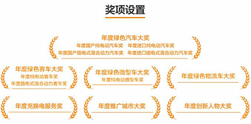 本次评选活动共设置七大类别14个细分奖项,分别是:年度绿色汽车大奖、年度国产纯电动汽车奖、年度国产插电式混合动力汽车奖、年度进口纯电动汽车奖、年度进口插电式混合动力汽车奖、年度绿色客车大奖、年度纯电动客车奖、年度插电式混合动力客车奖、年度绿色微型车大奖、年度纯电动微型车奖、年度电动物流车奖、年度创新人物奖、年度充电服务创新奖、年度推广城市大奖。