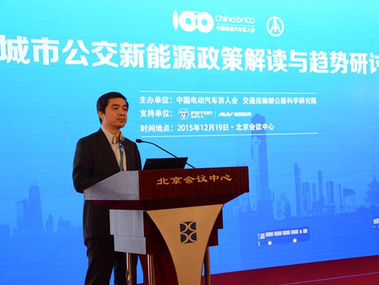 2015年12月19日,由中国电动汽车百人会与交通运输部公路科学研究院联合举办的“城市公交新能源政策解读与趋势研讨会”在北京召开,国务院发展研究中心原党组书记陈清泰、交通运输部运输服务司副司长王水平、工业和信息化部装备工业司副巡视员瞿国春、中国道路运输协会城市客运分会理事长张国光、中国电动汽车百人会执行副理事长欧阳明高等参加会议并讲话。