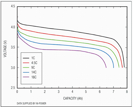 从典型放电曲线图上可以看出,电池放电电流越大,放电容量越小,电压下降更快。