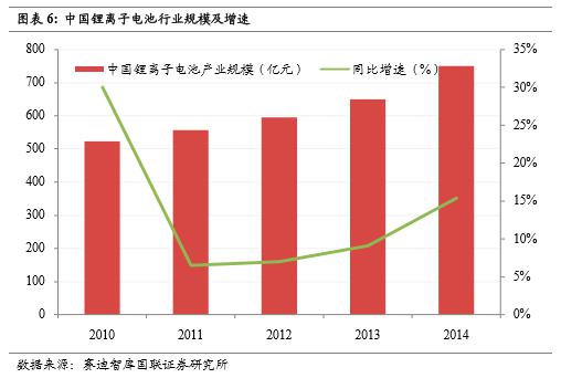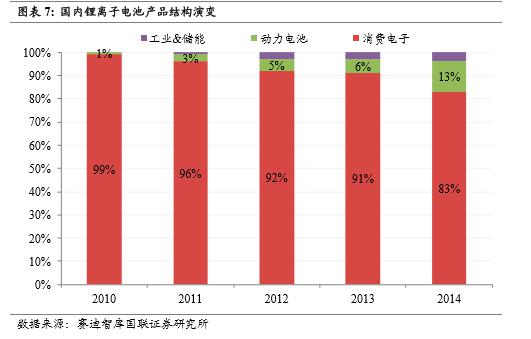 2014 年电动汽车动力电池在锂电池中的占比为16%,已经成为手机、便携式电脑之后的第三大 应用领域。动力电池占比呈现加速增长的态势: