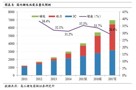 国联证券预计,未来三年国内动力电池产能将达到60GWh,16、17年均新增产能有望达到 20GWh。