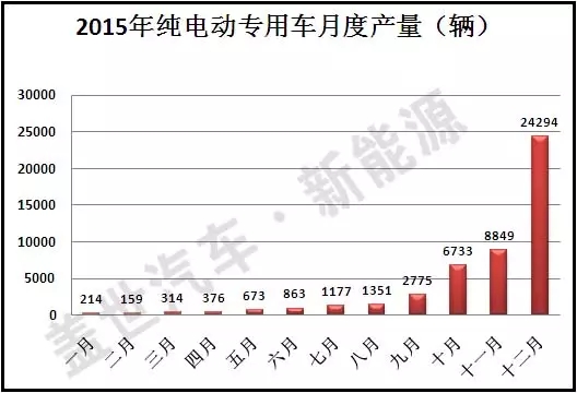 得益于国家政策和地方政策,纯电动专用车的发展更加给力。其中1月份产量为214辆,2月份159辆,3月份314辆,4月份376辆,5月份673辆,6月份863辆,7月份1177辆,8月份1351辆,9月份2775辆,10月份6733辆,11月份8849辆,12月份24294辆。环比增长率分别为﹣26%、98%、20%、79%、28%、36%、15%、105%、129%、31%、175%。