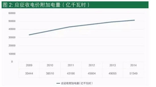 加速提升的电价附加征收标准反映出中国可再生能源发电的快速发展。根据电力企业联合会的数据,风电发电量从2009年的276亿千瓦时,增加到2014年的1598亿千瓦时,五年时间增长接近五倍。