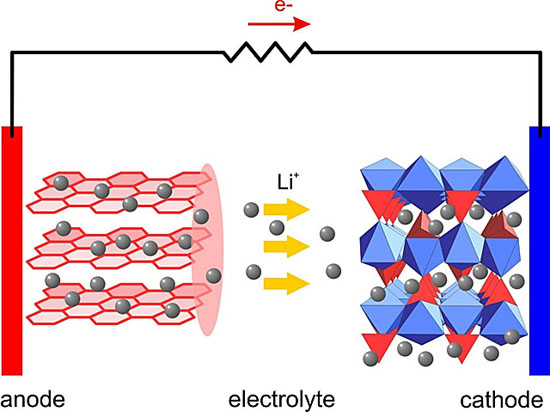我们先看石墨(C6)所在的负极。负极的任务很简单,放电时保证锂原子(不是离子)都在负极表面失去电子,充电时再把它们抓回来就好了。由于充电时阳极电压低,带正电的锂离子会自发向负极移动,得到电子回归为锂原子。