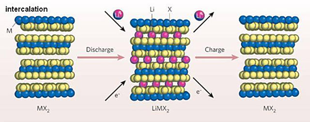 我们可以看到,MX2们在正极基底上形成了几层很规整(很有序)的结构,放电时,电子在正极(正极)聚集,锂离子向正极移动,穿插进入MX2结构的空隙,从而有序的分布在正极表面。MX2中的金属离子得到电子被还原,从而起到氧化剂的作用。