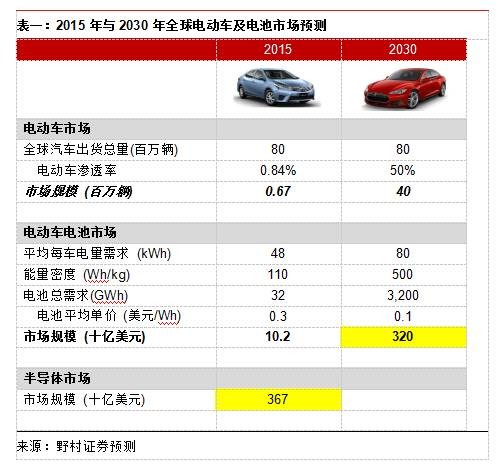 我们假设全球电动汽车的电池市场普及率能达到50%,估计电动车动力电池市场规模将在2030年达到3200亿-4000亿美元,几乎与目前全球半导体市场营收持平。