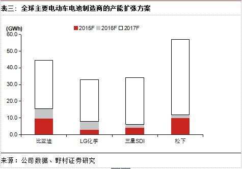 同时,我们注意到电池厂商还需要不断扩大产能,以获得成本优势,这也与半导体行业情况类似。比亚迪目前拥有世界上最大的电动汽车的电池容量,2016年底之前实现15.9千兆瓦时。但松下和特斯拉的超级电池工厂(GigaFactory)将生产35千兆瓦时。2016-2020 财年,我们认为大部分产能扩张将来自比亚迪、松下、LG化学和三星SDI等主要电动汽车生产商。