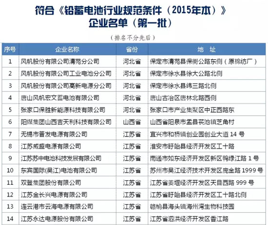 为推动我国铅蓄电池行业可持续发展,依据《铅蓄电池行业规范条件(2015年本)》及《铅蓄电池行业规范公告管理办法(2015年本)》,工业和信息化部开展铅蓄电池行业规范管理工作。经企业申请、省级工业和信息化主管部门初审、专家审核、工业和信息化部复核以及网上公示等程序,39家企业列入《符合<铅蓄电池行业规范条件(2015年本)>企业名单(第一批)》,现予以公告。