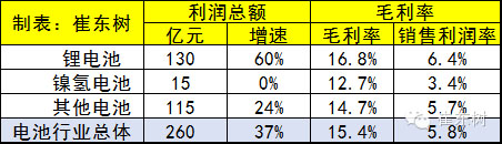 15年的电池行业因新能源车火爆而日子很好利润增长丰厚,其中锂电池企业的利润增长达到130亿元,增长60%。销售利润率也达到6.4%,远高于镍氢电池企业和铅酸电池企业的盈利。镍氢电池行业处于艰难的低增长的日子。