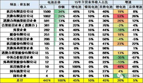 锂电池行业的高增长主要是其他有限责任公司和港台企业的表现很强,收入高增长。而国企性质的企业在新能源产业是较差的,没有有效的产品投入。未来国企大汽车集团可能有钱投资,但与民营相对的体制差距太大,估计也是很难发展。