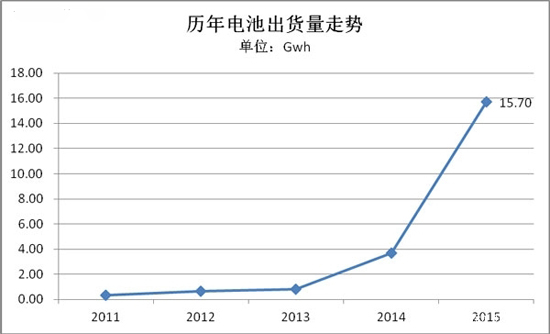 2015年新能源汽车产量达37.9万辆,伴随其爆发式增长,电池出货量也呈现较强走势。从近5年动力电池走势看,2014年之前,电池产量都低于1GWh,产量仅维持小幅增长。直到2014年动力电池出现小幅提升,达3.7GWh,再到2015年攀升至15.7Gwh,同比增长3倍之多。政策红利激活私人消费市场,拉动新能源汽车爆发式增长,使得电池整体出货量剧增。(注释:以下动力电池数据源于新能源汽车产量与其搭载的电池容量乘积。由于未考虑其他影响因素,总体实际产能会略高于此。电池产量计算公式:车型搭载电池容量*车型产量)
