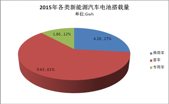 细分不同车型看,源于新能源客车对电池需求本身就高于其他车型,外加2015年各大车企追逐政策红利,对新能源客车的产能倾斜(尤其是6-8米纯电动客车),使得新能源客车搭载电池量依旧占据市场主力,达9.63Gwh,占全年总电池产量的61%;对应新能源乘用车搭载电池量为4.2Gwh,占比总量的27%;纯电动专用车搭载电池量达1.86Gwh,占比仅10%。
