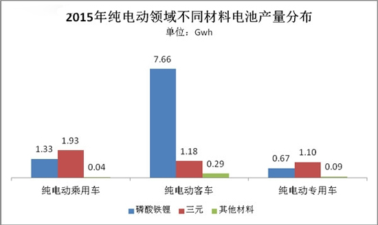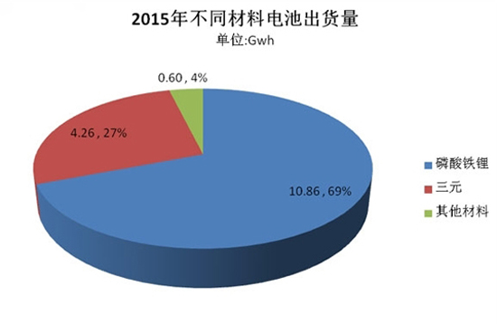 根据不同电池材料看,2015年磷酸铁锂电池出货量达10.86Gwh,占据市场近69%份额;对应三元材料电池出货量为4.26Gwh,占比27%;而对应锰酸锂、钛酸锂、超级电容、镍氢电池等其他材料电池出货量仅0.6Gwh,占比4%。
