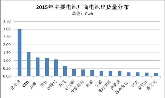 分电池厂商看,2015年全年出货量超过1Gwh的厂商仅5家:比亚迪、宁德新时代(CATL)、力神、合肥国轩高科、沃特马。5家厂商累计电池出货量达8Gwh,占比总量的近5成。