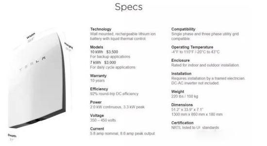 特斯拉家庭用电池能量墙Powerwall分为两种,一种是6.4kWh的价格为$3,000美元,一种是10kWh的价格为$3,500美元,停产的是10kWh的(见下图)。