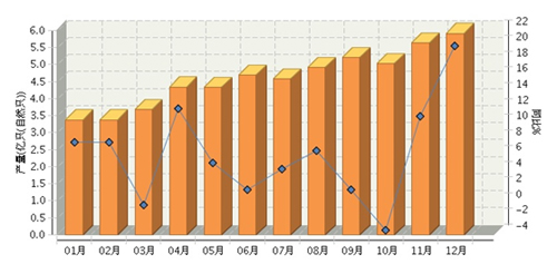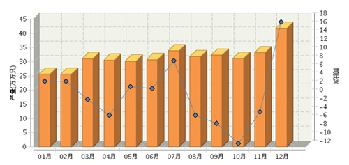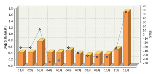 2015年1~12月,全国太阳能电池行业累计完成产量同比增长22.68%。其中:12月份完成产量同比增长23.33%。2015年全国太阳能电池行业月度产量及同比如下图所示。