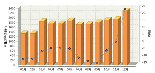 2015年1~12月全国碱性蓄电池行业累计完成产量同比增长-17.25%。其中:12月份完成产量同比增长62.17%。2015年全国碱性蓄电池行业月度产量及同比如下图所示。