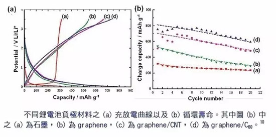 既然单独使用石墨烯作为负极不可行,那至少可发展石墨烯复合负极材料吧。目前较可靠之石墨烯负极之电容量可达540 mAh/g( Honma, 2008),其充放电曲线与循环寿命分析 (如图1所示)。此外,石墨烯工艺中修饰C60与CNT形成复合材料,可将材料之电容量分别提升730及784 mAh/g,也证实碳材具较大层间距时能有较佳之储电能力。
