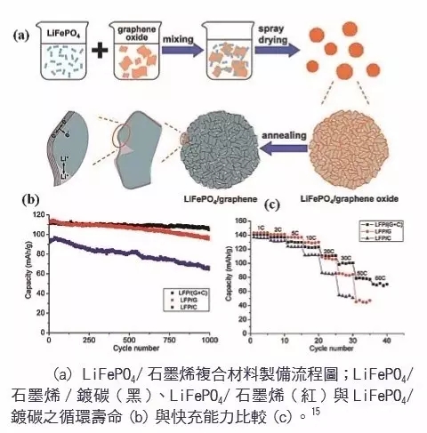 作为正极材料要求大容量及优异的循环特性,为使电池能够急遽充放电,可采用提高活性物质的电子传导性、离子传导性及缩短传导距离的方法来进行。Zhou(2011)利用石墨烯添加在LiFePO4/C复合材料,亦即将磷酸锂铁正极材料放入氧化石墨烯溶液,再搭配喷沫造粒合成出微米级的二次粒子,从微观角度观察石墨烯均匀披覆在磷酸锂铁材料的表面,从电性的比较结果显示在循环寿命与快充能力(如图2所示),石墨烯的添加能显著提升磷酸锂铁正极材料的稳定性以及大电流充放电的表现。