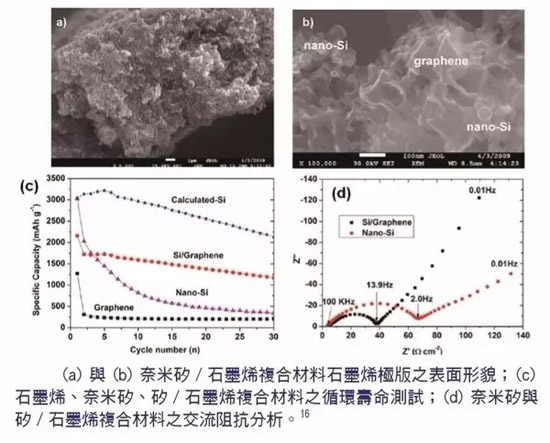 在负极材料方面,Chou (2010)结合高电容量的納米硅负极(40nm)与具柔 软特性的石墨烯以穆尔比1:1的比例进行混合,其极板之表面形貌 (如图3所示),納米硅与石墨烯均匀地混合在一起,在循环寿命的表现,硅/石墨烯复合材料之循环寿命与纯納米硅相比可显著地提升,经过30个cycles仍保有1300mAh/g 的电容量表现,在交流阻抗分析结果亦显示相较于納米硅,硅/石墨烯复合材料的阻抗可降低到40 Ω,预期亦可提升此材料的快充特性。