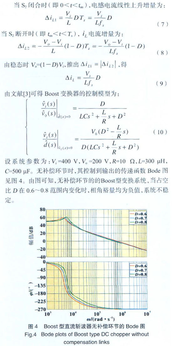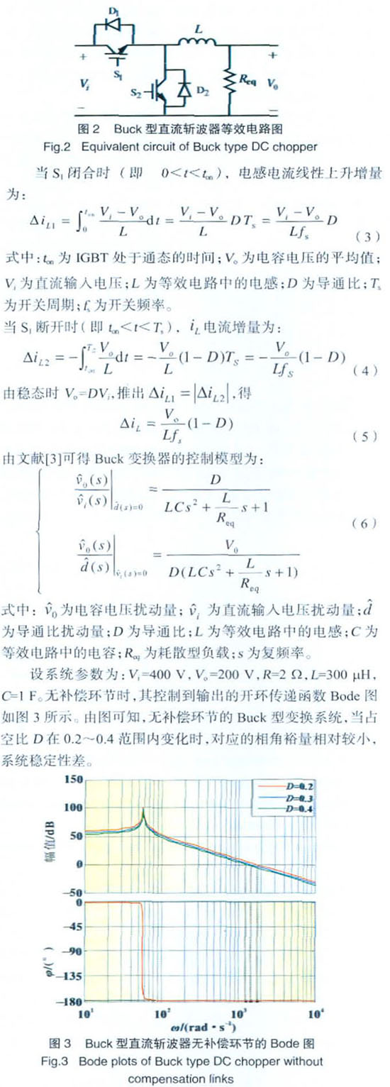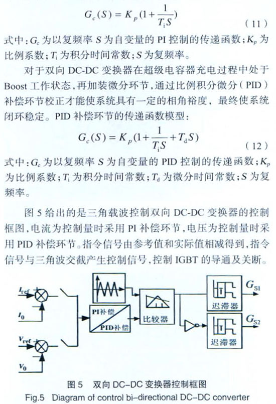 由自动控制理论的知识,对于双向DC-DC变换器在超级电容器充电过程中处于Buck工作状态,通过比例积分(PI)补偿环节校正就可使系统具有一定的相角裕度,从而使系统闭环稳定。PI补偿环节的传递函数模型: