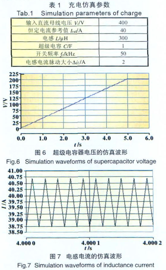 由图6可见,对超级电容器进行恒定的大电流充电,其电压随时间近似直线上升直至饱和,这种电压随时间大幅度上升表明超级电容器可以在短时间内吸收高能量。由图7可见,采用PI补偿环节可以得到仅有5%脉动的较为恒定的充电电流,同时使系统较开环时稳定。