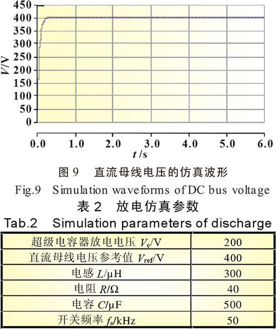在PSCAD/EMTDC电力系统仿真软件中建立了超级电容器以电压为控制量的恒压放电仿真模型。仿真参数见表2。仿真图形见图9。