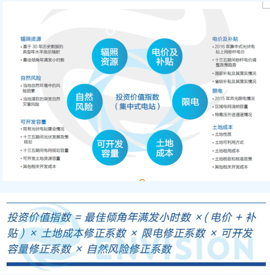 针对以上行业痛点,记者与中国气象局风能太阳能资源中心等部门结合辐照资源、电价补贴、限电、土地成本、可开发容量、自然风险六大维度,建立覆盖全国的集中式光伏电站投资价值数据库,提出集中式光伏电站的“投资价值指数”,推出《2016年中国光伏资源投资价值地图(集中式电站篇)》,打造符合中国本土的资源数据库和投资模型。