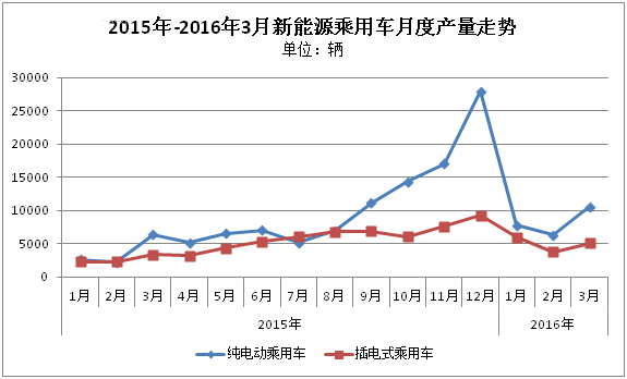 2016年新能源乘用车销量受开年淡季的影响,经过前两月的连续下滑,在3月开始出现上涨趋势。据乘联会数据统计,2016年3月新能源乘用车销量达1.56万辆,环比增长55%,与去年同期相比增长60%。截至目前,第一季度累计销量已达3.95万辆,同比增长超过1倍,实现月均1.3万辆左右的销量水平。