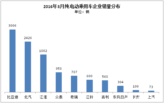 分车企看, 10家纯电动乘用车企业排行中,比亚迪以3006辆的水平居于首位,而北汽则由2月排名首位滑至本月第2名,而江淮继续维持第三名的地位。值得指出的是,虽然排名有所改变,但总体看,细分到3月各家车企销量都有不同程度的提升。其中,3月销量过千辆的车企依旧是前三名,比亚迪、北汽、江淮三家企业累计销量达7234辆,占纯电动乘用车总销量的69%。而销量过百辆的企业也达9家,较之2月有大幅提升。