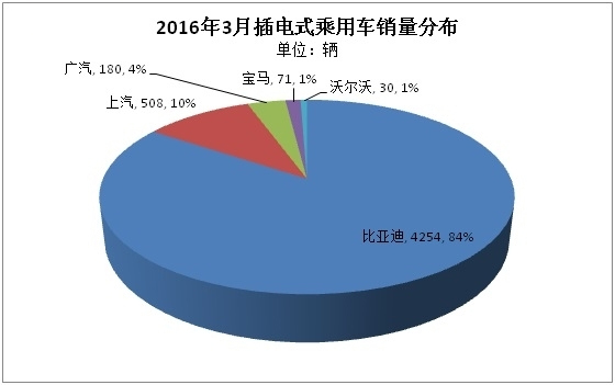 细分看,3月销量增长幅度最大的当数比亚迪,由2月1217辆的水平攀升至3月3000多辆的水平,环比增幅达1.5倍。其中比亚迪纯电动乘用车车型逐步丰富,新推出的比亚迪秦EV3月销量也达229辆,此外,比亚迪e6、e5、腾势销量都有提升,e6也由2月1105辆的销量提升至3月2061辆的水平。总体看,纯电动乘用车销售比例在比亚迪企业内部逐步加大,与插电式混合动力乘用车比例基本持平,各占50%。